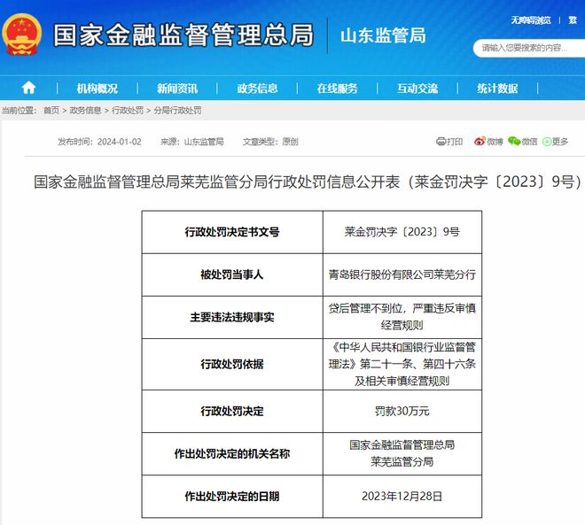 同日,青岛银行莱芜分行被国家金融监督管理总局莱芜监管分局处以罚款30万元。行政处罚决定书文号为莱金罚决字〔2023〕9号,主要违法违规事实为贷后管理不到位,严重违反审慎经营规则。