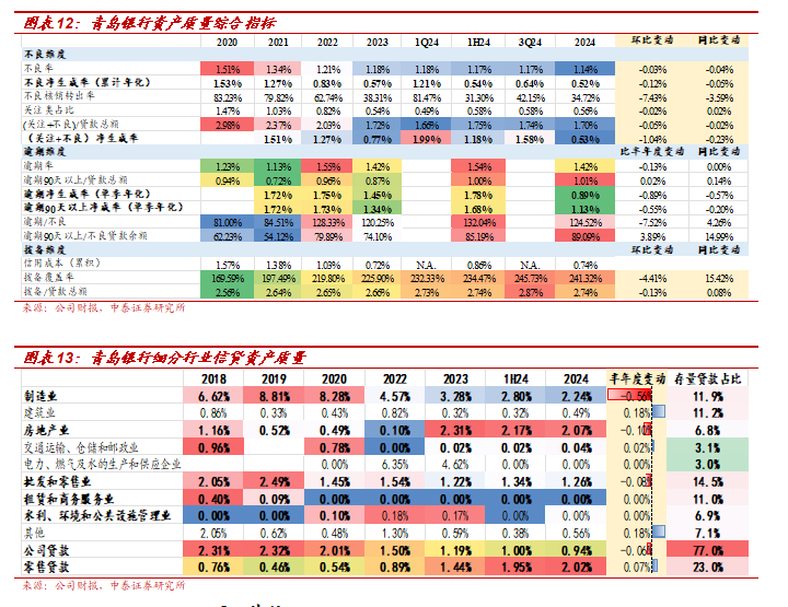 行业不良率来看:(1)对公:不良率较1H24下降6bp至0.94%,制造业不良率持续下降,较半年度下降56bp至2.24%,批零下降8bp至1.26%,地产不良率下降10bp至2.07%。(1)零售:不良率较半年度上升7bp至2.02%,不良率升幅较上半年收窄44bp。