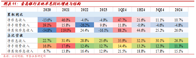 青岛银行2024年营收(相较财报扣除其他业务成本)同比+7.5%(3Q24为7.18%),净利润同比+20.15%(3Q24为+15.59%)。四季度负债端成本率下降支撑息差环比回升,带动净利息收入回升。同时债牛推动其他非息收入维持高增。