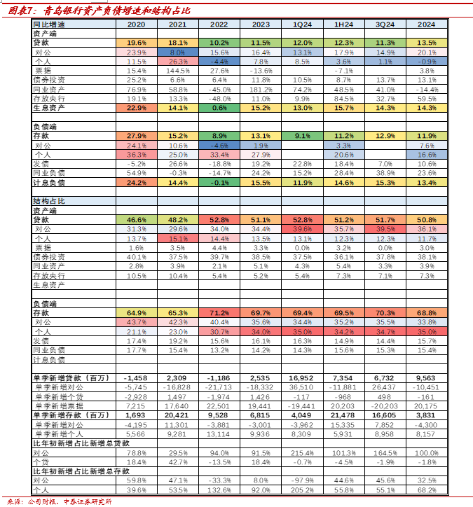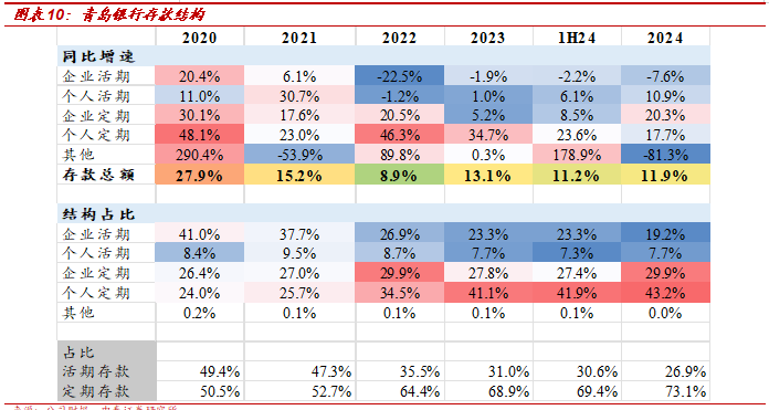 负债端:企业活期较弱,个人活期改善,整体定期化延续。存款同比增11.9%(3Q24同比+12.9%,2023年同比+13.1%)。对公活期负增,个人活期同比增10.9%,企业定期同比+20.3%,个人定期同比增17.7%。定期存款占比73.1%,同比4.2个点。