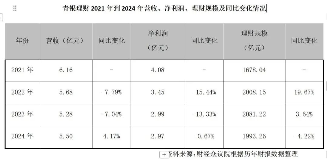 从2022年开始,青银理财遭遇营收、净利润双降,尤其是净利润连降3年。2024年营业收入、净利润分别为5.5亿元、2.97亿元,净利润创成立以来的最低水平,当年理财管理规模回落至2000亿元以下。
