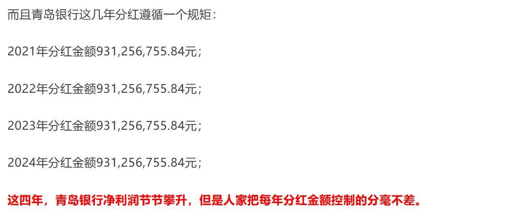 比中期分红“爽约”更受诟病的,是青岛银行近年分红政策的“原地踏步”。财报数据显示,2021 年至 2024 年,该行年度分红金额均为 931,256,755.84 元,四年间分毫不差。