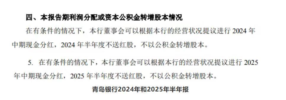 令人玩味的是,青岛银行在 2025 年半年报中,原封不动地复制了上述关于中期分红的表述。面对投资者的追问,该行先是在 7 月回应称“将充分考虑股东诉求与资本状况,动态评估中期分红事宜”,随后在 9 月 30 日通过深交所互动易平台明确表示,“中期分红需平衡短期股东回报与长期业务发展资金需求,当前聚焦战略转型及资产质量优化,资本补充需优先保障业务拓展与风险抵御,中期分红事项暂无最新进展”。这