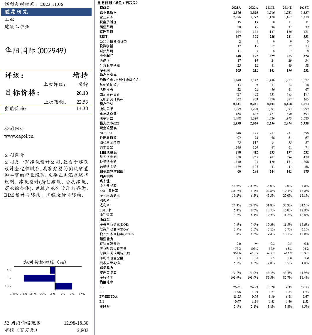 1.维持增持。前三季度调整业务结构等致业绩低于预期,但公司盈利能力显著提升,维持预测2023-2025年EPS 0.83/1.00/1.18元增45/20/18%。大盘相关板块估值下修,给予公司2023年24倍PE,下调目标价至20.1元。