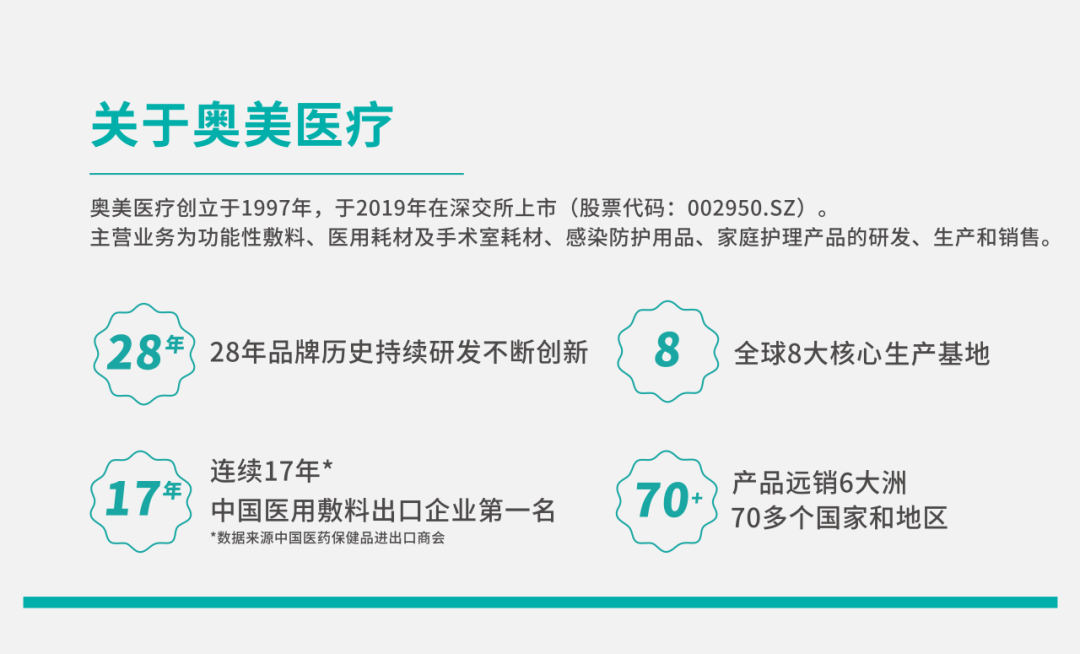 奥美医疗作为全球领先的医用敷料和感染防护解决方案供应商,是全球范围内具备在医用敷料、感染防护产品、医用非织造产品实现一体化、规模化、智能化生产能力的全产业链制造企业之一。此次参展,充分展现了奥美医疗在手术室护理领域的产品创新与战略布局,也凸显了在医工结合,研发创新,智能智造等方面的优势。