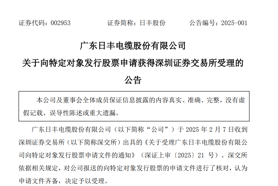 2月9日,日丰股份(002953.SZ)发布关于向特定对象发行股票申请获得深交所受理的公告。