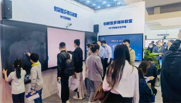 在鸿合爱课堂的展位上,嘉宾与观众仔细聆听讲解人员的介绍与演示,踊跃体验丰富的演示方案,并就技术与操作细节进一步询问交流。