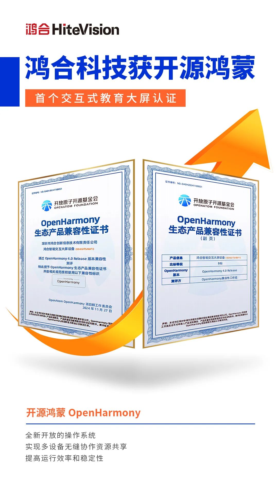 推动信创与 AI 在教育领域的深度融合,彰显前沿创新成果与实力。近日,鸿合智能交互平板获开源鸿蒙首个交互式教育大屏认证,从芯片、系统及应用多维度实现信创国产化全覆盖。鸿合智能交互平板搭载开源鸿蒙OpenHarmony,支持多设备无缝协作、资源共享,显著提升了运行效率和稳定性;搭载一体化超清摄像头,2000W超高像素,全新多点触控技术,引领未来智慧教育新风尚。