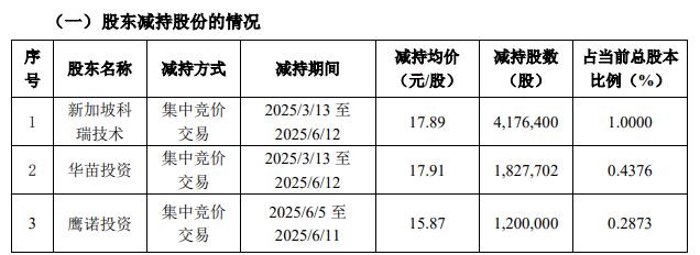 公告显示,2025年3月13日至2025年6月12日,新加坡科瑞技术减持均价17.89元/股,减持股数4,176,400股;华苗投资减持均价17.91元/股,减持股数1,827,702股。2025年6月5日至2025年6月11日,鹰诺投资减持均价15.87元/股,减持股数1,200,000股。经计算,新加坡科瑞技术、华苗投资、鹰诺投资合计减持股数720.41万股,减持金额达1.26亿元。