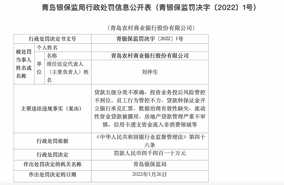 1月28日晚,青岛银保监局公开行政处罚信息,青农商行因贷款五级分类不准确、投资业务投后风险管控不到位、员工行为管控不力、贷款转保证金开立银行承兑汇票、数据治理有效性缺失、流动性资金贷款被挪用、房地产贷款管理严重不审慎、信用卡透支资金流入非消费领域等多项案由,被青岛银保监局处以罚款人民币4410万元。