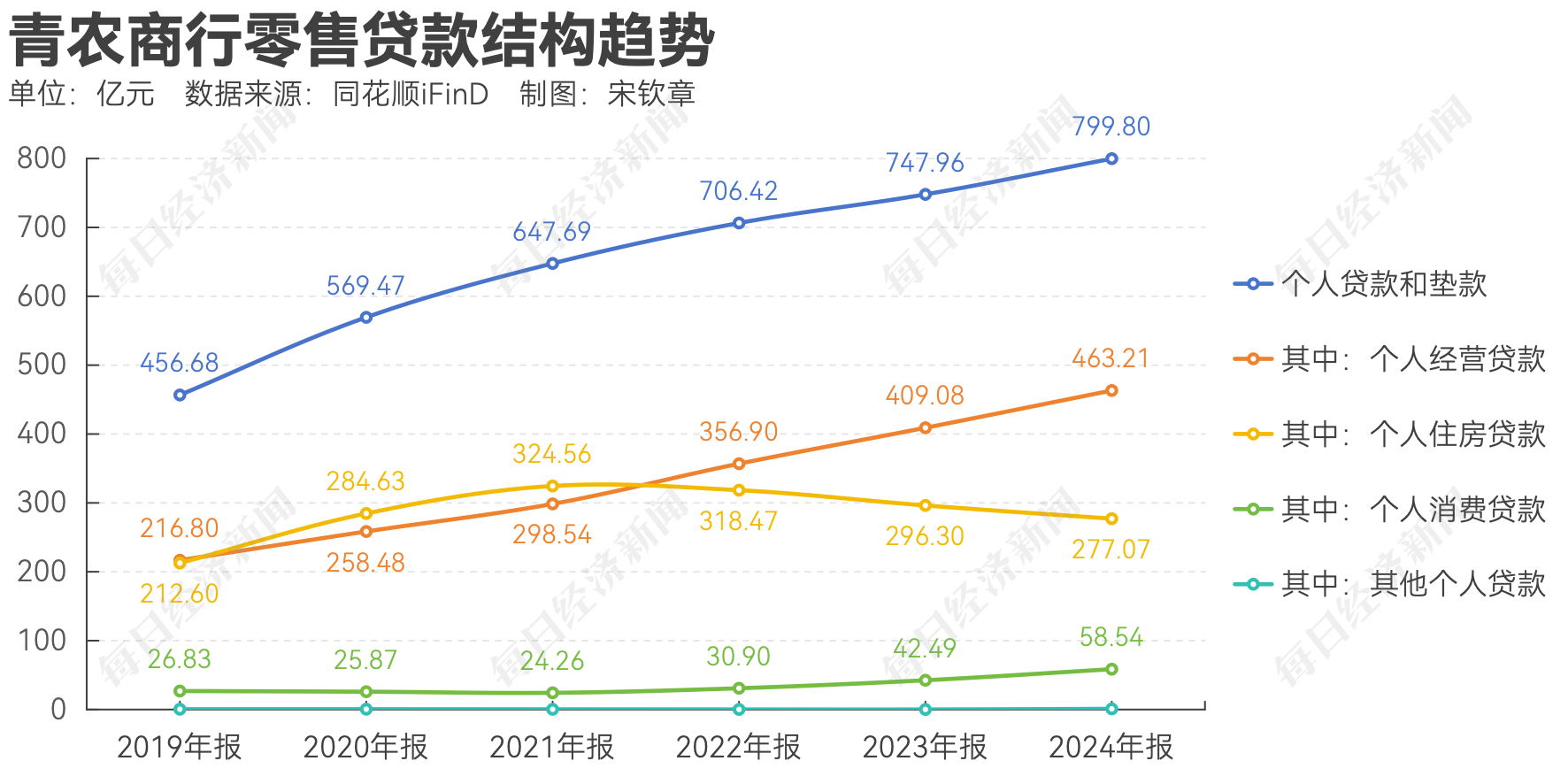 《每日经济新闻》记者注意到,在银行业零售贷款占比(即个人贷款及垫款总额占贷款总额的比例)普遍呈现下降趋势的情况下,青农商行这一数据却在逆势提升。对此,青农商行表示,这是由于公司重点加大对小微企业主和个体工商户经营性贷款及农户等经济主体的贷款投放。近几年,青农商行通过总行部门架构整合、推出线上个人贷款产品、建设信贷工厂等举措,完善零售业务布局。