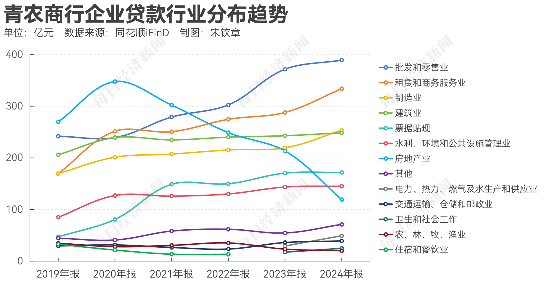从不良贷款的行业分布情况来看,截至2022年底,青农商行不良贷款金额最高的行业是房地产业,占该行不良贷款总额的近30%。近年来,青农商行逐步调整其贷款业务的行业结构,投向房地产业的贷款明显减少,相关的不良贷款也随之减少。从2020年底至2024年底,房地产业贷款在青农商行企业贷款及垫款总额中的占比从23%大幅下降至7%。与此同时,批发和零售业、租赁和商务服务业等行业的贷款占比则显著上升。