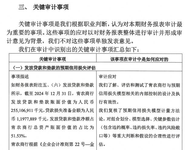 近日,立信会计师事务所为青农商行出具 2024 年审计报告。根据报告,其对青农商行的财报整体出具了无保留意见,但对"发放贷款和垫款的预期信用损失评估"及"结构化主体合并评估"项目列为关键审计事项,却表示"不对这些事项单独发表意见"。