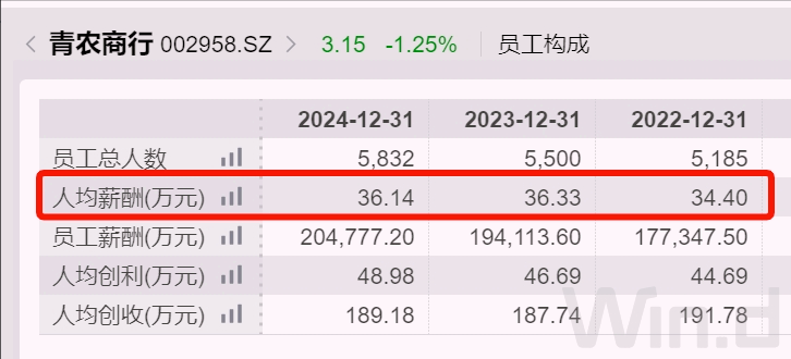 至2024年末, 青农商行 职工总数5800余人,去年人均创利约49万元;人均税前薪酬36万元,基本持平。