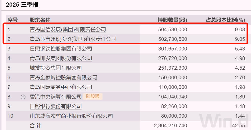 青农商行 股权较为分散,名义上无控股股股东和实控人,但第一大股东 青岛国信发展 集团和第二大股东和青岛城建集团,持股都超过9%,背后都是青岛市国资委,合计控制18%以上股权,远远超过其他股东持股比例。