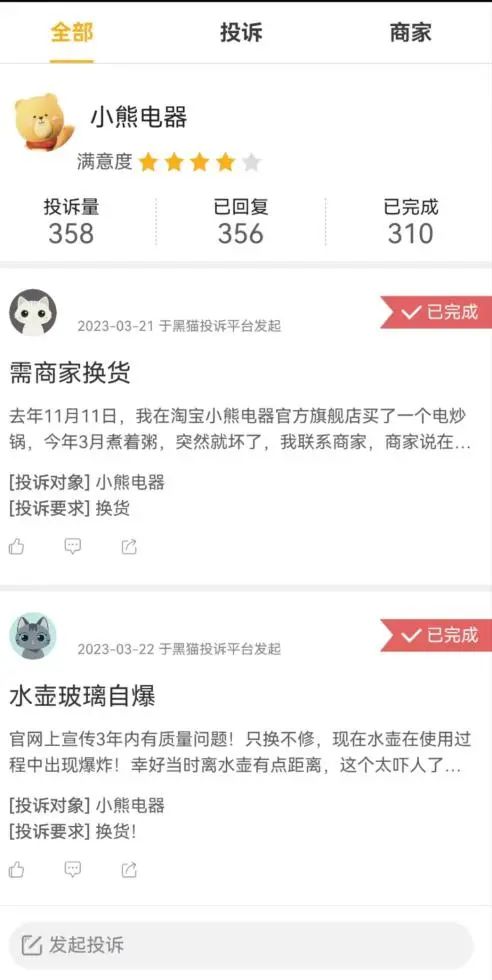 截止2023年4月21日中午20时,浏览黑猫投诉平台,“小熊电器”相关投诉累计有358条,主要集中在产品质量、虚假发货等投诉。