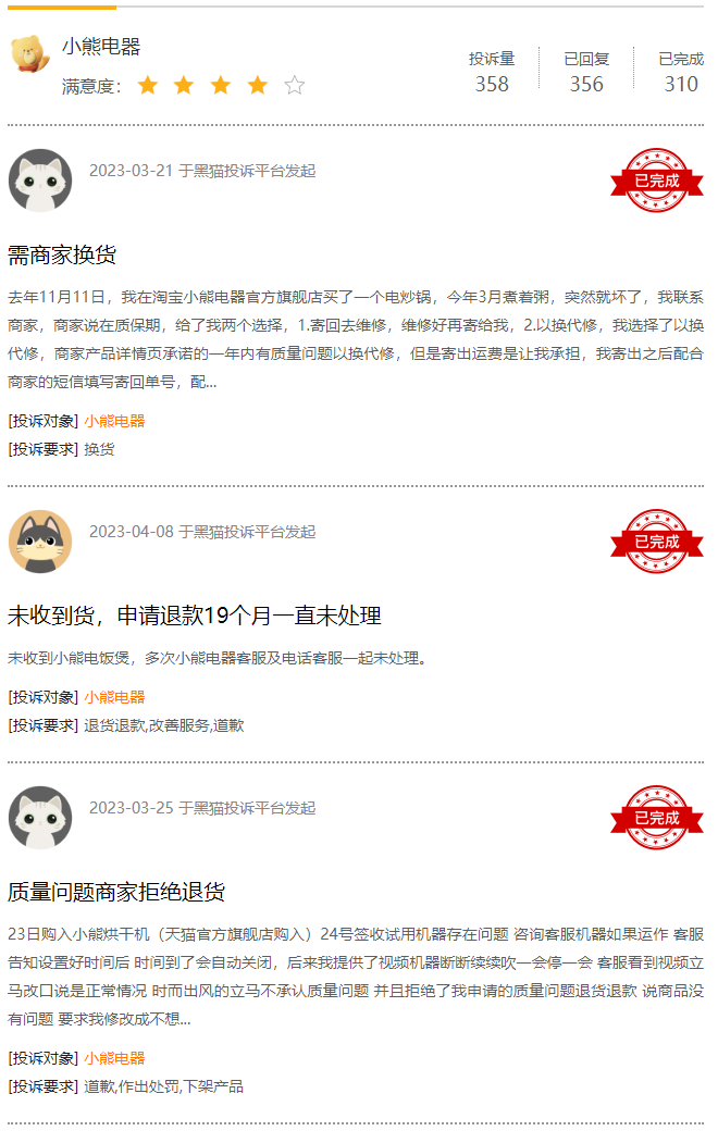 首先是质量方面的指控。在黑猫投诉平台上,小熊电器设计投诉量358起,内容涉及产品存在漏水、漏电、期货的故障,产品多次维修依旧发生故障、发货产品以旧代新、售后不作为、虚假宣传等。2020年到2022年期间,小熊电器均有产品不合格通报。