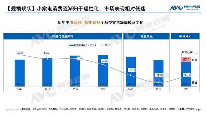 根据奥维云网的数据显示,厨房小家电零售额增幅最后一次超过10%出现在2016年,随后便连年下滑,在小熊电器实现增长奇迹的2020年,更是跌破X轴迈入负增长。