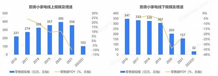 而对厨房小家电零售额进行进一步细分可以发现,虽然整体趋势在2020年迈入负增长,但主要原因是线下渠道销售额的大幅下滑,同年线上销售额还保持着接近10%的增幅。