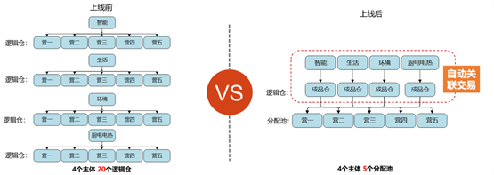 从上图可以看出,小熊营销中台上线前有4个主体业务,需要虚拟设置20个逻辑仓来进行库存管理,假如要查询库存,就要从20个逻辑仓进行相应的匹配,比较繁锁。营销中台系统上线后,仅需5个分配池就可以满足需求,库存查询时只需看对应的分配池,也就是说从原来的20个精减到5个,库存查询更简化。