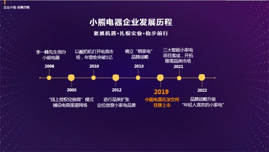 小熊电器成立于2006年3月,是一家以自主品牌“小熊”为核心,运用互联网大数据进行创意小家电研发、设计、生产和销售,并在产品销售渠道与互联网深度融合的“创意小家电+互联网”企业,不断向消费者推出精致、创新、智能、健康的创意小家电。