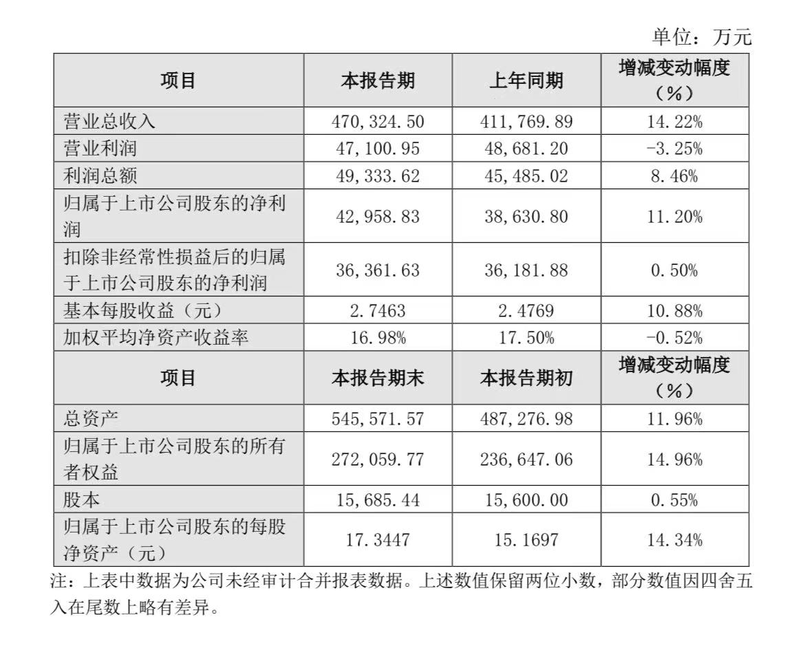 根据公告,公司实现营业总收入约47.03亿元,同比增长14.22%;归属于上市公司股东的净利润约4.3亿元,同比增长11.2%。
