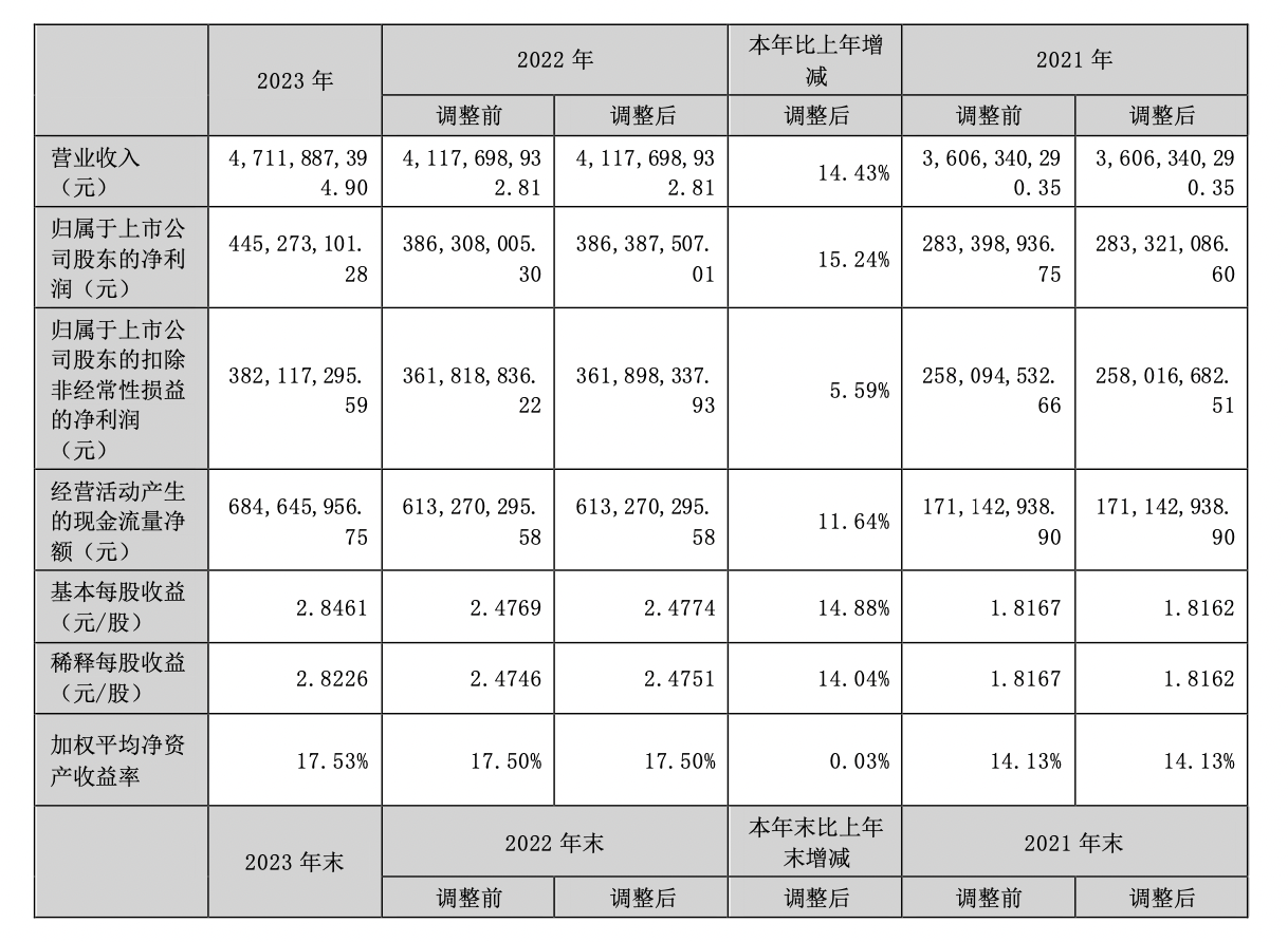 根据公告,公司实现营业收入约47.12亿元,同比增长14.43%;归属于上市公司股东的净利润约4.45亿元,同比增长15.24%。