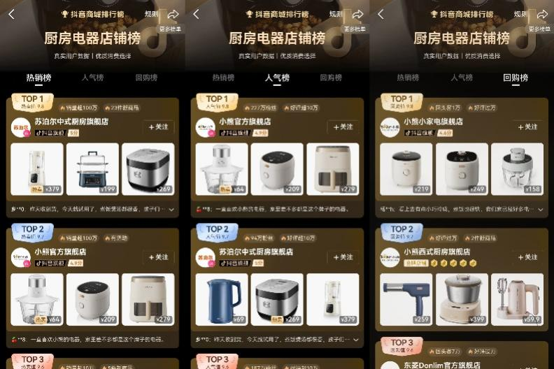 在抖音上,从2023年3月31日至2024年4月10日,近一年时间内小熊电器官方号在抖音累计直播384场。在“抖音商城排行榜”中的“厨房电器店铺榜”,“小熊官方旗舰店”分别在人气榜、回购榜中排名第一,在热销榜中,仅次于“苏泊尔中式厨房旗舰店”排名第二。