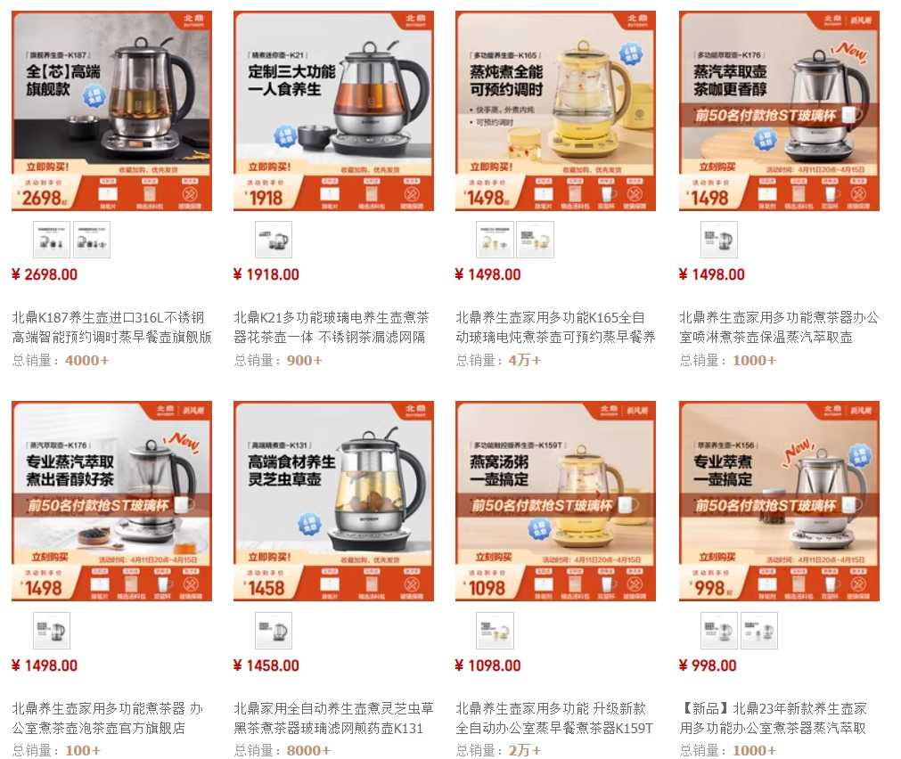 值得一提的是,据“奥维云网”数据显示,养生壶品类2023年6月的月度均价为121元,而北鼎的养生壶能卖到上千元。在北鼎的天猫旗舰店里,最贵的一款养生壶售价达2698元,显示有4000+的购买量。