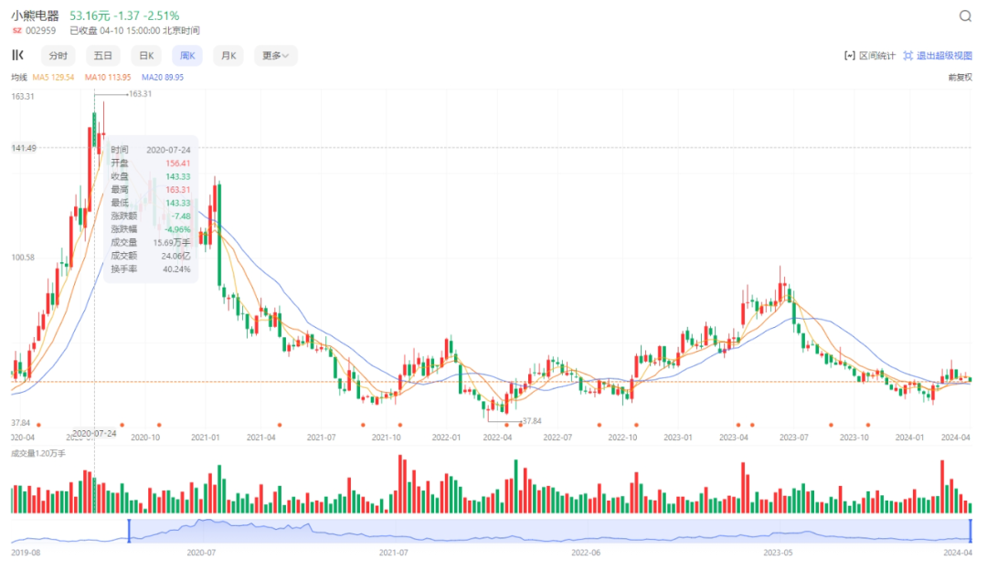 年报发布后,小熊电器在二级市场迎来了短暂的“欢愉时刻”;截至2024年4月9日收盘,小熊电器股价为54.53元/股,上涨1.06%。但到了4月10日,小熊电器报收于53.16元/股,下滑2.51%;到了4月11日收盘,股价继续下滑至51.8元/股。