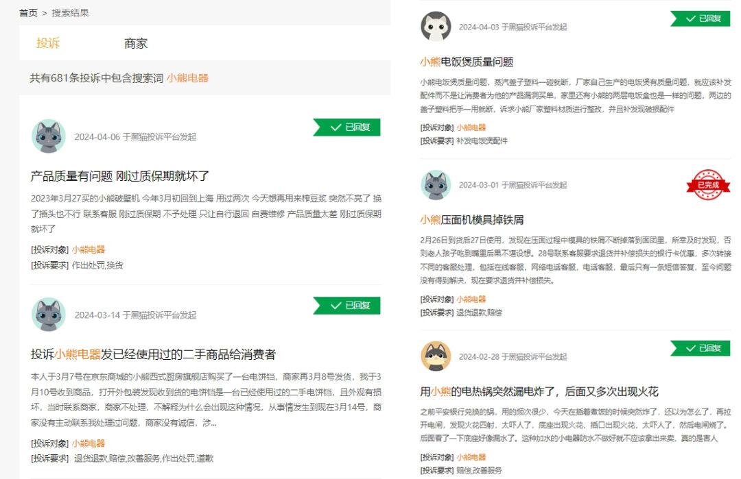 除产品因“鸡肋”被吐槽外,小熊电器的产品还曾因质量品控问题被投诉。截至4月10日,在“黑猫投诉”官网搜索“小熊电器”关键词,有681条相关投诉信息,其中有不少消费者反映小熊电器产品存在质量不稳定、不耐用易损坏等问题。