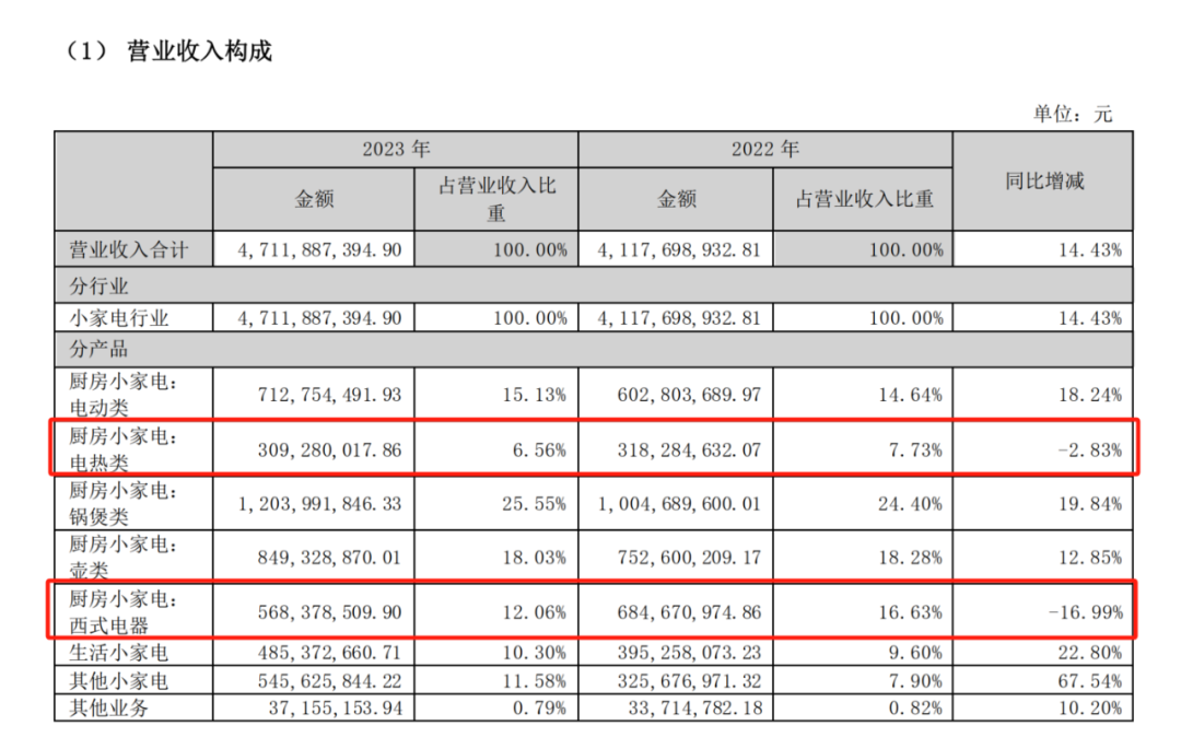 以其支柱业务,占比为77.33%的厨房小家电为例,其细分产品的营收有下滑趋势。