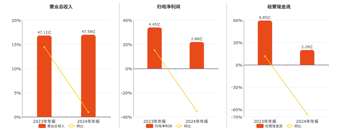 公司营业总收入为47.58亿元。归母净利润为2.88亿元,较去年同报告期归母净利润减少1.57亿元,同比较去年同期下降35.37%。经营活动现金净流入为2.29亿元,较去年同报告期经营活动现金净流入减少4.55亿元,同比较去年同期下降66.52%。