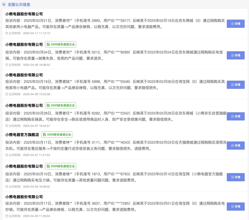 除受行业整体环境影响外,公司自身层面的问题同样不容忽视。全国12315消费者投诉信息公示平台上,有关小熊电器的多则投诉都涉及质量、售后服务等多方面问题。无独有偶,黑猫投诉平台显示,有关小熊电器的投诉数量累计超过千余条,其中产品质量和售后服务亦是消费者反映最为集中的两大问题。