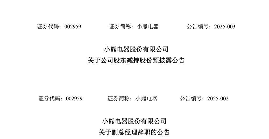 和股东减持公告同日发布的还有高管离职的公告。公告显示,欧阳桂蓉女士因个人原因申请辞去公司副总经理职务,同时辞去公司全资子公司佛山市瑞翌电子商务有限公司、佛山市小熊居家电器有限公司、佛山市艾萌电子商务有限公司、佛山市悦享电子商务有限公司、佛山市悠想电子商务有限公司经理职务。辞去前述职务后,欧阳桂蓉女士仍在公司任职并继续担任公司第三届董事会董事、第三届董事会战略委员会委员、第三届董事会提名委员会委员。