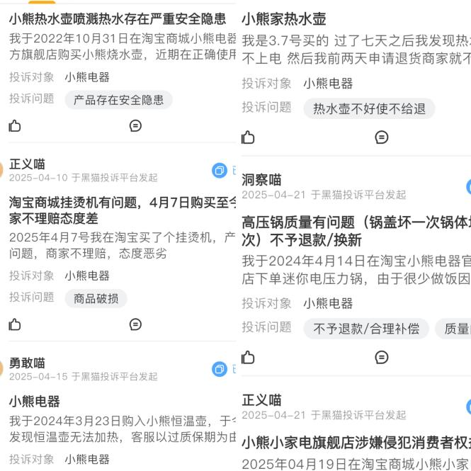 二来由于技术门槛低,产品质量确实没办法保障。全国12315平台和黑猫投诉平台显示,有关小熊电器的投诉数量累计超过千余条,其中广泛涉及产品质量和售后服务问题。