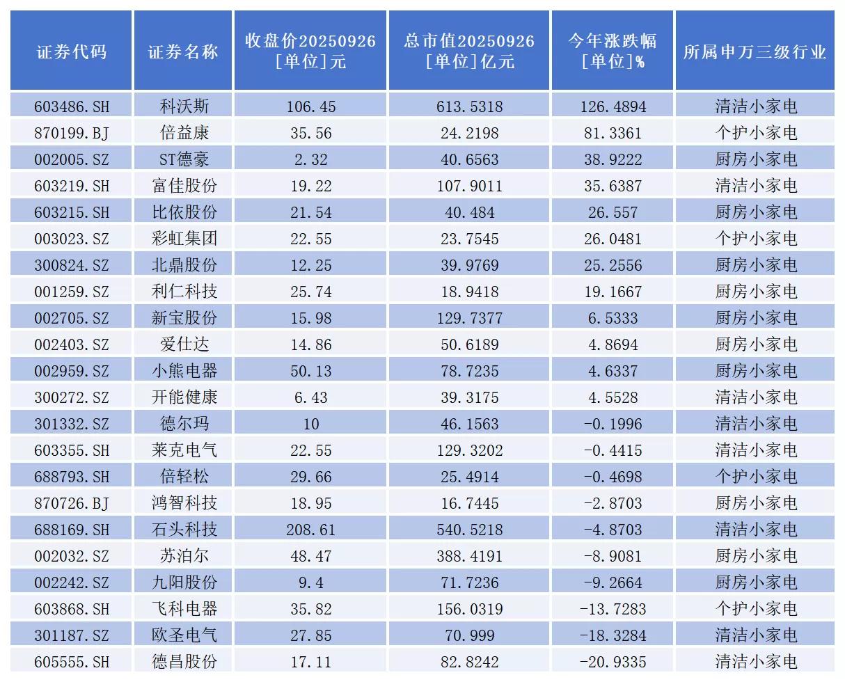 从二级市场表现看,截至9月26日收盘,今年以来,德尔玛、莱克电气、倍轻松、鸿智科技、石头科技、苏泊尔、九阳股份、飞科电器、欧圣电气、德昌股份等10家公司股价出现下滑。