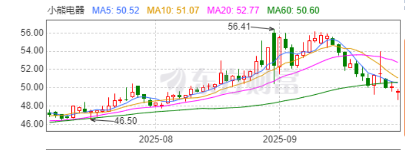 截至9月29日上午收盘,小熊电器报价49.58元/股,跌幅1.10%。