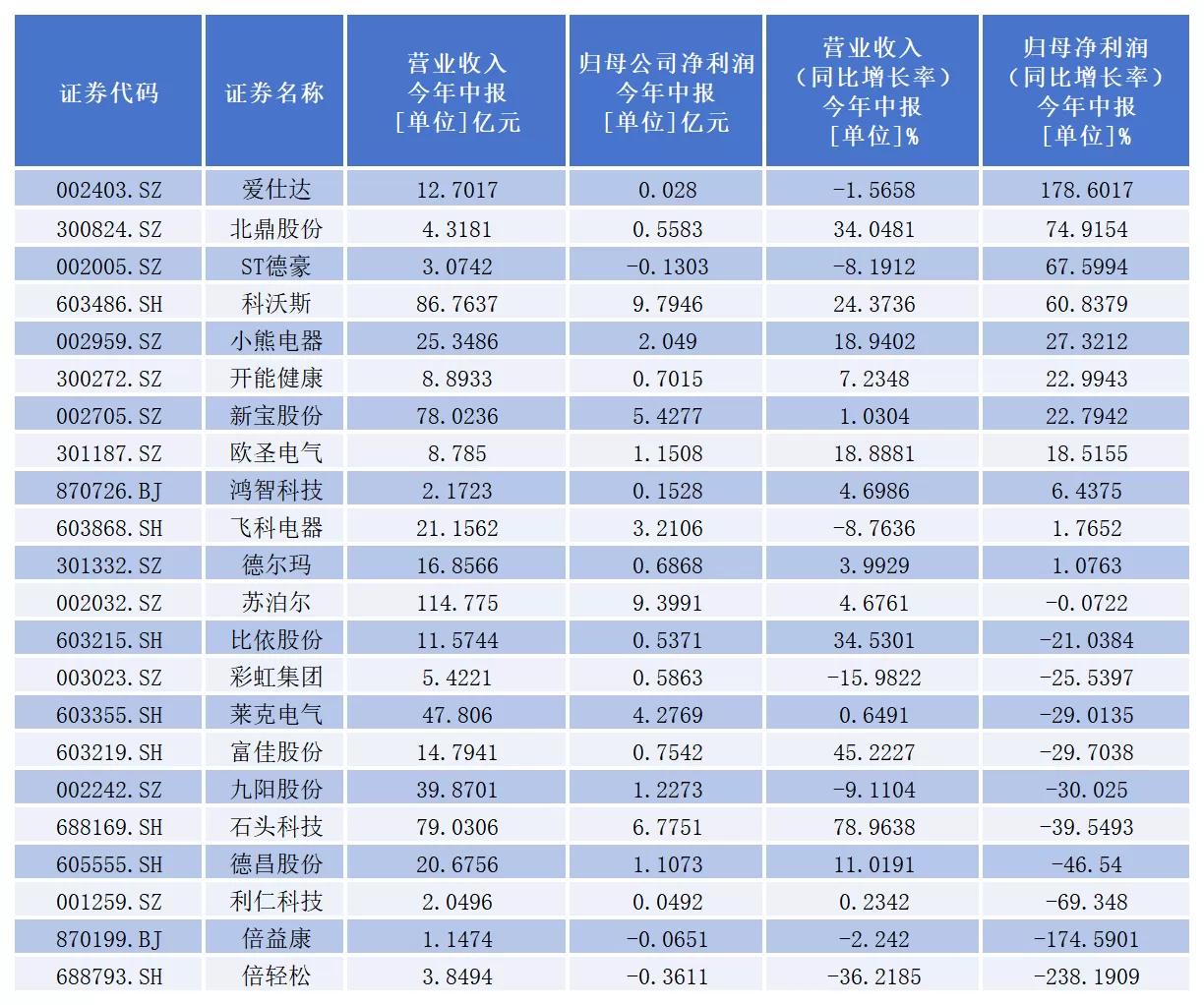 从业绩表现看,今年上半年,苏泊尔、比依股份、彩虹集团、莱克电气、富佳股份、九阳股份、石头科技、德昌股份、利仁科技、倍益康、倍轻松等11家公司净利润出现同比下滑。