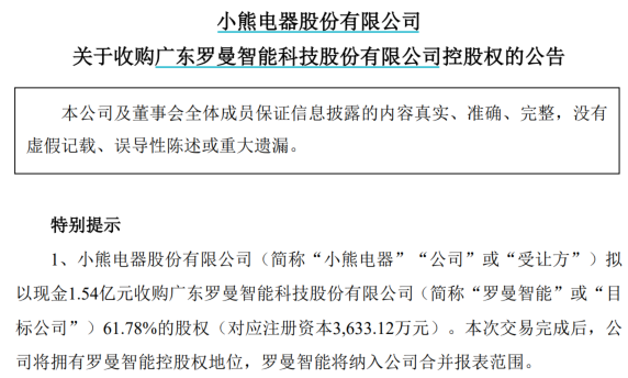 2024年7月,小熊电器以1.54亿元收购罗曼智能61.78%的股权,对应整体估值为2.5亿元,增值率109.23%。这一高溢价收购亏损企业的举动当时引发市场关注,但也体现了小熊电器通过外延扩张实现战略转型的决心。