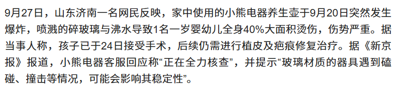 据《新浪财经》等多家媒体报道,2025年9月,山东济南一名网民反映,家中使用的小熊电器养生壶于9月20日突然发生爆炸,喷溅的碎玻璃与沸水导致1名一岁婴幼儿全身40%大面积烫伤,伤势严重。