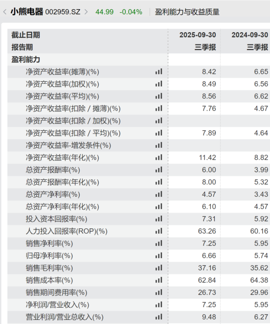 财务指标的优化同样令人瞩目。2025年三季度,小熊电器销售毛利率为37.16%,同比增加1.54个百分点。同时,通过精细化运营,销售、管理和财务费用率全面下降,整体费用率优化明显。