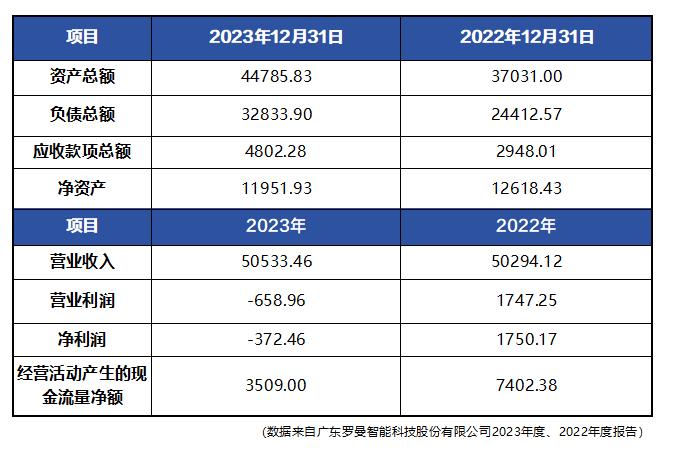 根据罗曼智能的财务数据,截至2023年年末,公司资产总额达44,785.83万元,负债总额为32,833.90万元,净资产为11,951.93万元。在经营层面,罗曼智能于2023年实现了50,533.46万元的营业收入,较上一年度增长0.48%。然而,在利润方面,公司出现了亏损,具体表现为营业利润为-658.96万元,净利润为-372.46万元。