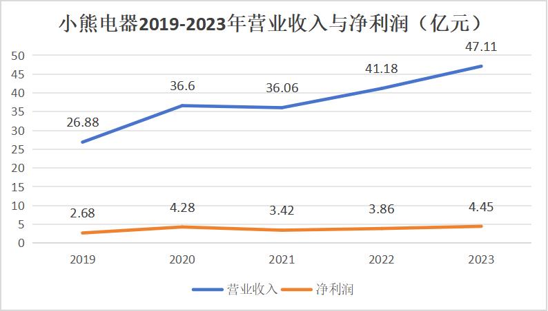 创立之初的小熊电器靠酸奶机“出圈”。之后的6年里小熊电器借助电商平台,采取互联网销售模式,快速扩充产品线,以厨房小家电为核心业务,带来豆芽机、煮蛋器等一系列创新小家电。财报数据显示,2019年至2023年,小熊电器的营业收入和净利润持续增长,市场份额逐步扩大。目前小熊电器市占率排名第4,位于行业巨头“苏美九”之后。