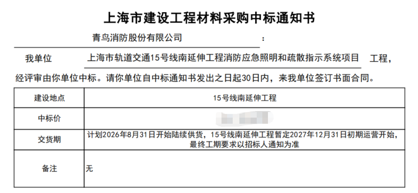 此次中标上海轨道交通15号线南延伸工程,是青鸟消防聚焦轨道交通细分领域、深耕消防科技的重要成果。作为消防行业标杆企业,青鸟消防依托核心技术破解轨道交通复杂场景下的安全痛点,其智能疏散解决方案不仅获得了市场的高度认可,更标志着公司向全链条解决方案服务商的稳步进阶。未来,青鸟消防将持续以技术创新为核心驱动力,不断升级产品与服务体系,深耕城市轨道交通等关键领域,以专业实力护航城市公共安全,切实履行消防企业的责任与担当。