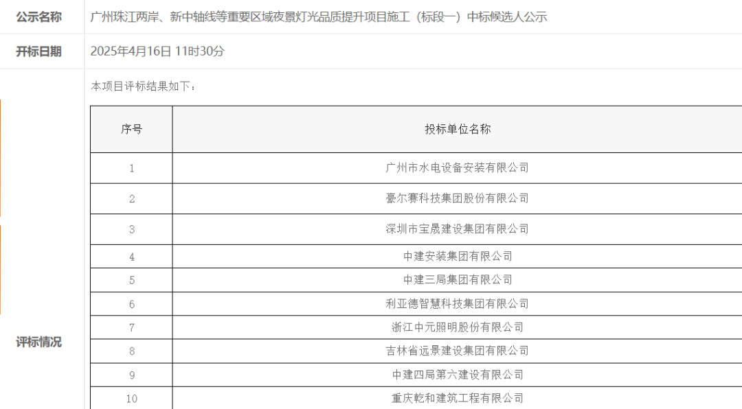 2025年4月18日,广州公共资源交易中心网站公布了《广州珠江两岸、新中轴线等重要区域夜景灯光品质提升项目施工(标段一至标段五)》的中标候选人已正式对外公示。该项目旨在提升广州市重要区域的夜景灯光品质,打造更加璀璨夺目的城市夜景。以下是各标段的中标候选人情况: