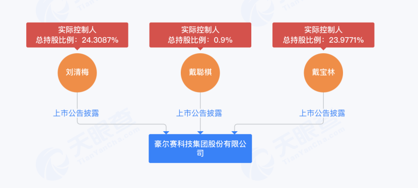 从股权结构来看,豪尔赛具有较为典型的家族企业特征。戴宝林、刘清梅、戴聪棋直接和间接持有公司股份合计占总股本的49.19%,三人作为公司的共同实际控制人。其中戴宝林与刘清梅为夫妻关系,戴聪棋为二人之子。
