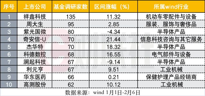 根据wind统计,截至2月7日,年初至今被超过10家公募基金调研过的上市公司共计182家。整体而言,工业机械、电子元件、电子部件与设备、西药、半导体产品等所属个股,颇受公募基金关注,调研次数位居前列。