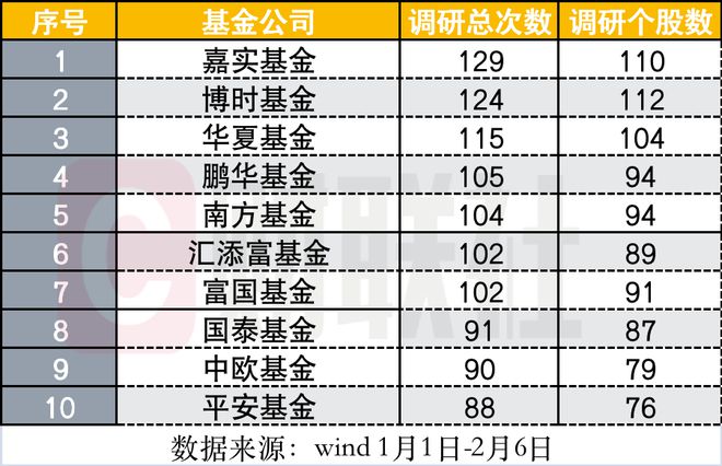 截至2月7日,开年已有3家公募基金调研个股总数超过100只。wind数据显示,博时基金、嘉实基金、华夏基金分别参与了112只、110只、104只个股的调研活动;与此同时,南方基金、鹏华基金、富国基金年初至今调研个股总数均超90只。