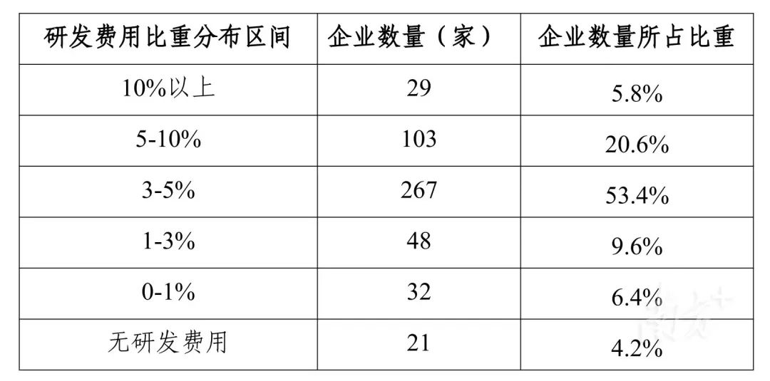 值得注意的是,和2023年相比,500强企业研发投入有所降低。从研发费用占营业收入的比例分布来看,研发费用占比较高的企业数有所下降,10%以上、3%—5%之间的企业均同比减少了1个百分点。